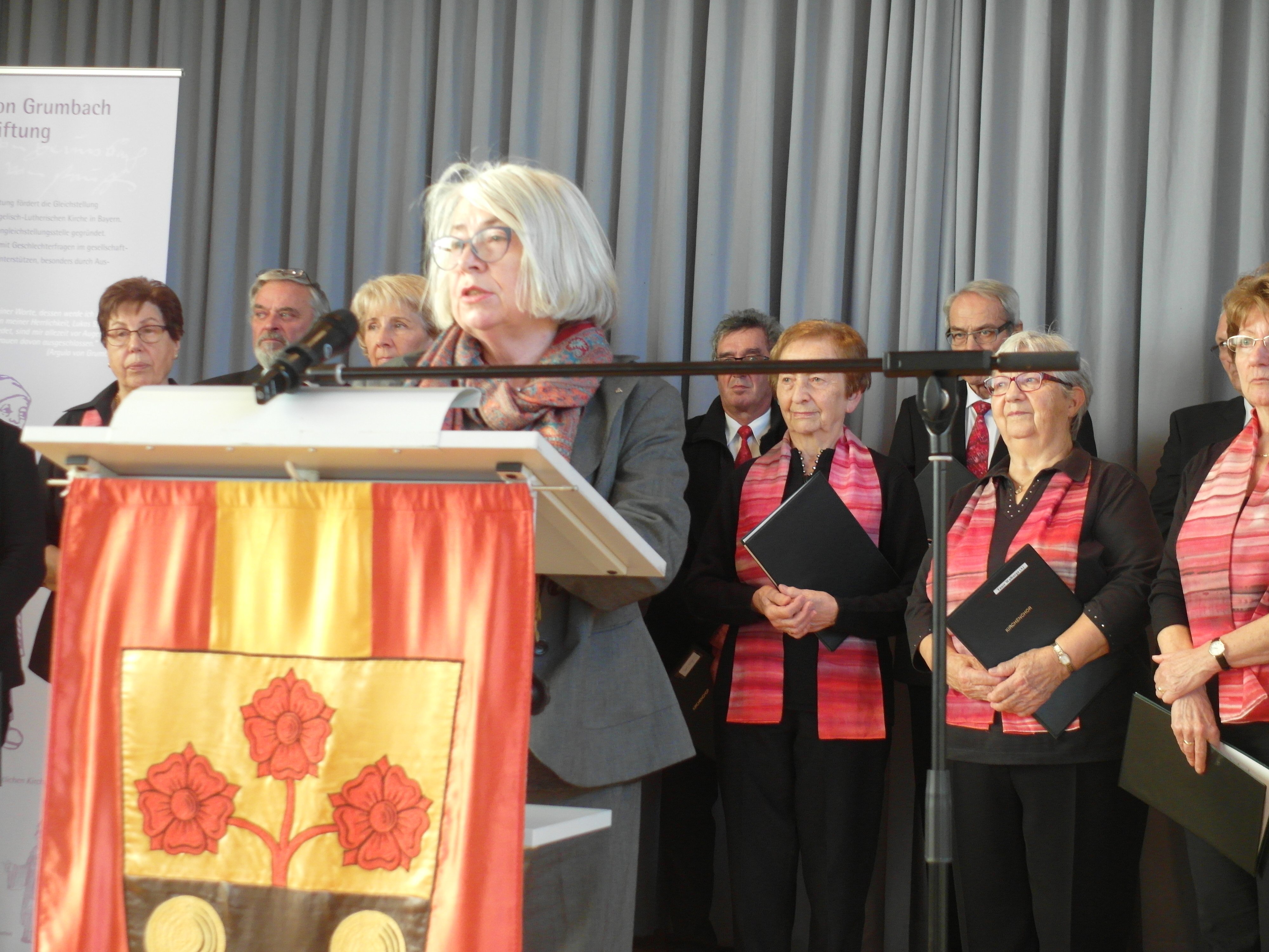 „Schade, Argula, dass Du nicht Mitglied bei uns im Deutschen Evangelischen Frauenbund bist!“, sprach die DEF Landesvorsitzende Inge Gehlert die Reformatorin direkt an. Denn ein solches Mitglied mit solchem Mut und Engagement in den eigenen Reihen zu haben, hätte dem Evangelischen Frauenbund gut angestanden. Erfreulich sei es, wenn die Landeskirche auch einmal an die Frauen und Frauenverbände denke und nicht nur die kirchlichen Herren und auch manchmal Damen zu Wort kämen. Gehlert sprach die „Frauenorte“ in Niedersachsen an, an denen an bedeutende Frauen erinnert wird. Es gebe zwar schon viele Denkmäler für Männer, aber an Frauen und ihr Wirken werde noch selten gedacht. Daher habe sich der DEF gerne an der Errichtung des Denkmals beteiligt. „Wir wünschen, dass dieses Denkmal eine Strahlkraft entfaltet und Frauen sich ein Beispiel an Argula von Grumbach nehmen und ebenfalls mutig und beredt für ihre Sache streiten.