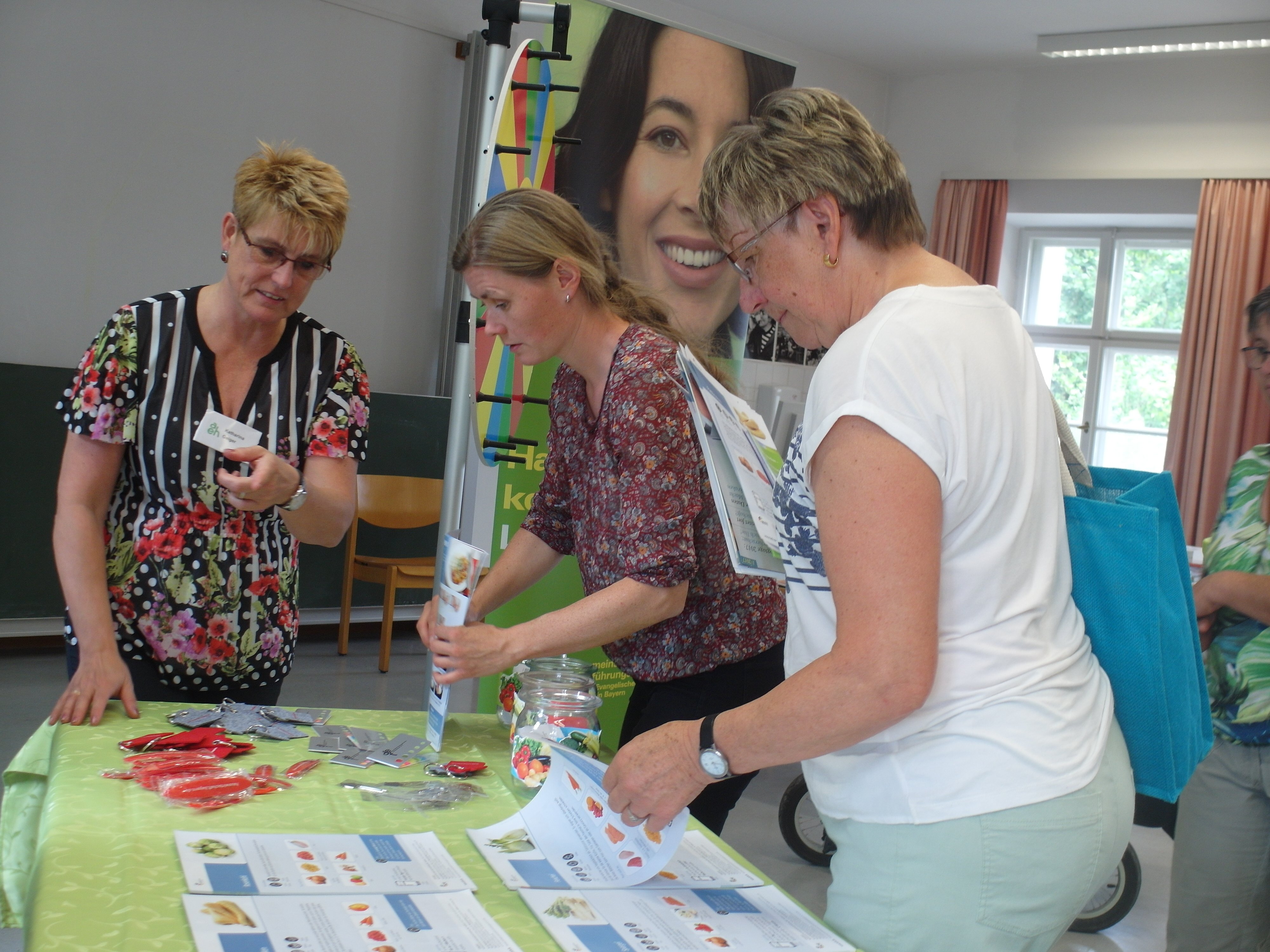 Gemüse war dann aber auch das Motto des raumbeherrschenden AEH-Stands im Weißen Schloss. In der bewährten Standgemeinschaft mit der BayLaH und zusätzlich einem Fachbuchhändler zog der Stand viele Besucherinnen und ihre Familien an. Für die diesjährige Aktion waren Abreißblöcke des Bundeszentrums für Ernährung (BZfE, früher aid-Agrarinformationsdienst) ausgelegt worden. Von Chicoree bis Rote Bete, Bohnenkraut bis Wirsing konnten Informationen und Rezepte einfach vom Block abgerissen werden. War die Hemmschwelle bei den ersten beiden Infoblättern vielleicht noch groß, so schwand sie mit jedem weiteren und manche Besucherinnen rissen sich so ein ganzes kleines Gemüsebeet an Informationen herunter. Für Fachfragen und zum Gespräch standen die AEH-Kolleginnen stets zu mehreren zur Verfügung. Sie hatten auch Dutzende neue Quizfragen zum Glücksrad ersonnen, und sollte deren Beantwortung den Familien ein bisschen schwer gefallen sein, so verstanden sie auch freundlich ein wenig nachhelfen, damit ein Preis mitgenommen werden konnte. Die AEH hat gewissermaßen auf diesem Aktionstag wie in einem Garten die Pflanzen so das Wissen über die Gemüsesorten gesammelt und vermehrt. So war es für die AEH und ihre mehreren hundert Besucherinnen ein ertragreicher Johannitag.