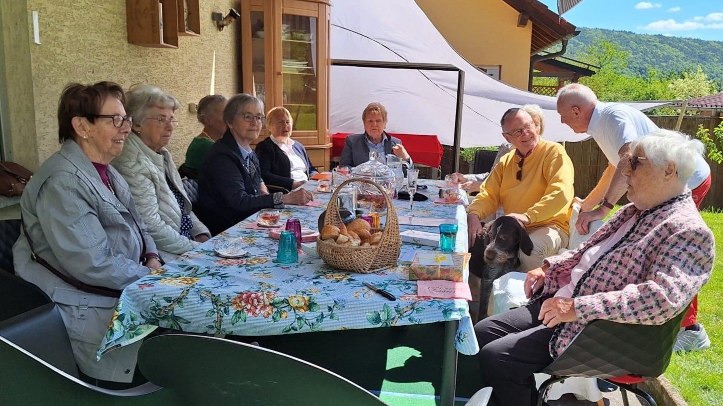 Sie hatte den Ortsverband zu diesem Tag zu sich nach Neustadt/Main eingeladen, wo sie seit fünf Jahren bei ihrer Tochter, die ebenfalls Mitglied im Ortsverband ist, und ihrem Schwiegersohn lebt. Es war ein strahlend schöner Sommertag im Spessart, sodass die angereisten Frauenbundmitglieder auf der Terrasse und im Garten das Geburtstagskind feiern konnten. Hier hatten ihre Tochter, ihr Schwiegersohn und viele fleißige Hände eine nahrhafte Brotzeit und Kuchen vorbereitet. Mit alkoholfreier Erdbeerbowle oder anderen Getränken stießen alle auf das Wohl des Geburtstagskinds an.