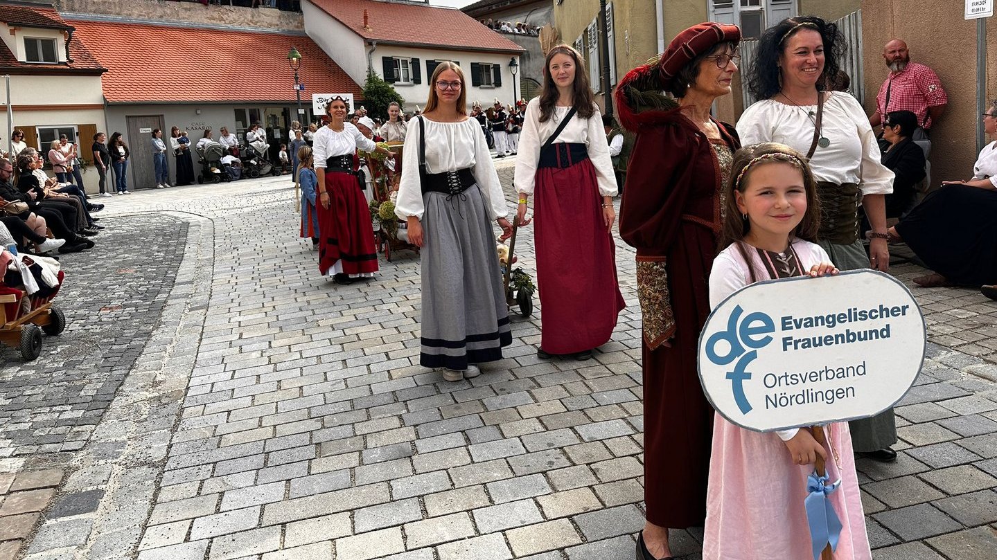 Die Frauen des Deutschen Evangelischen Frauenbundes (DEF) - Ortsverband Nördlingen - präsentierten sich beim Stadtgründungsfest 2025 mit einem liebevoll gestalteten Stand. Besucherinnen und Besucher konnten historische Gewänder und Gebrauchsgegenstände betrachten und an zahlreichen Mitmachaktionen teilnehmen.
