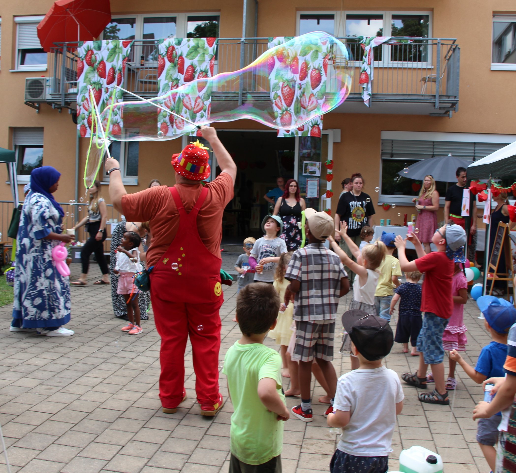 Am 19. Juli 2024 verwandelten sich die Wohnheime in der Frühlingstraße in eine bunte Sommeroase. Bei strahlendem Sonnenschein und Temperaturen von bis zu 30 Grad wurde unter dem Motto "Strawberry Summer" ein ausgelassenes Fest für die Bewohnerinnen und deren Kinder sowie Freunden und Verwandten und geladene Gäste gefeiert. Weit über 80 Teilnehmer fanden sich ab 13 Uhr ein, um gemeinsam einen Nachmittag voller Spiel, Spaß und Gemeinschaft zu erleben.