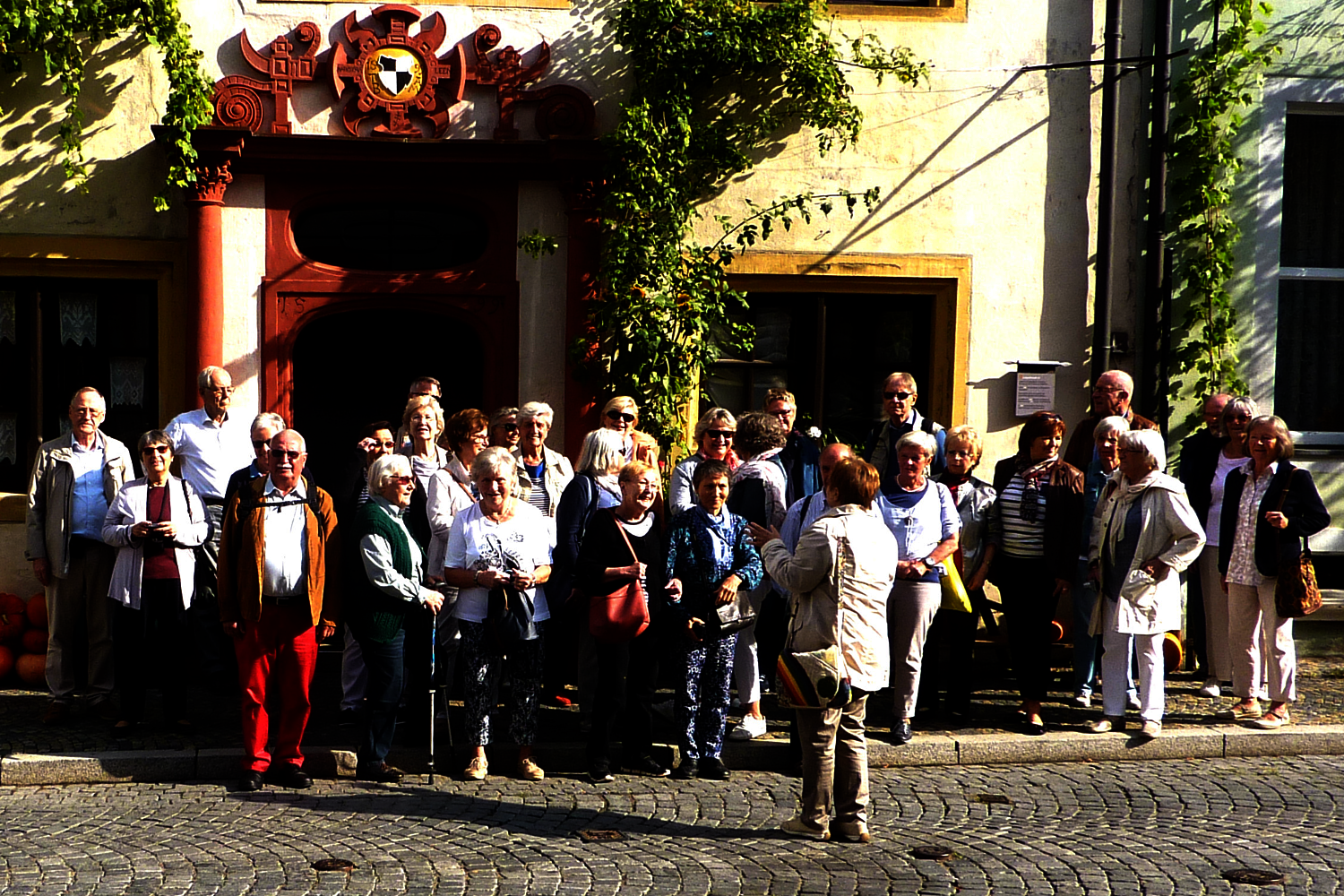 In Prichsenstadt erwartete der Stadtführer Klaus Zapf die Gruppe und führte sie in fränkischer Mundart, mit selbstgedichteten Liedern und der alten Stadtglocke durch den historischen Stadtkern mit Kirchenbesichtigung.