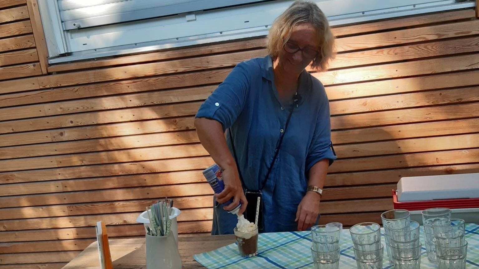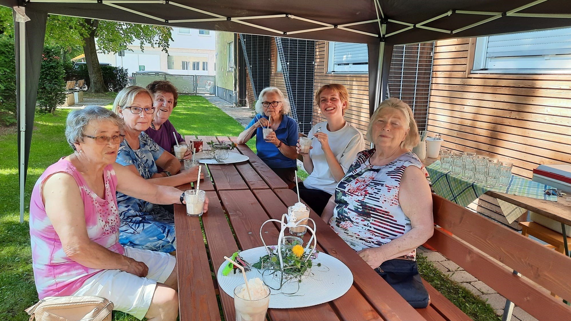 Sigrid Fernando verwandelte kurzerhand der Garten für die Mieterinnen in einen kühlen Ort und servierte Eiskaffee oder Eisschokolade. Unter dem schattigen Pavillon genossen die Frauen diese willkommene kulinarische Abkühlung bei sommerlichen Höchsttemperaturen. Den ganzen Nachmittag hindurch war ein Kommen und Gehen, einige verweilten länger und genossen die Gespräche, andere erfrischten sich nur kurz mit einem Eiskaffee.