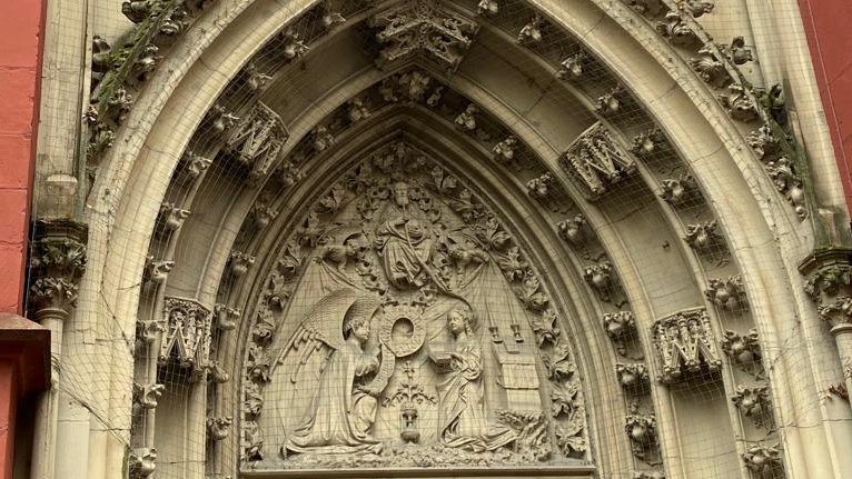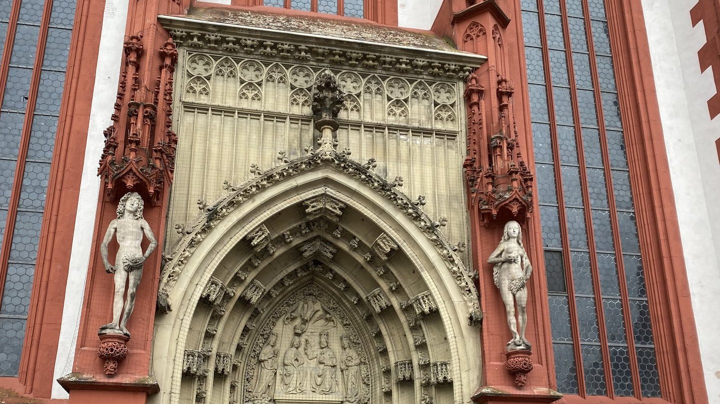 Auf dem Marktplatz präsentiert die Marienkapelle auf zwei Strebepfeilern die Kopien der Figuren von Adam und Eva und birgt im Innenraum den Grabstein für Konrad von Schaumburg in Rittergestalt mit einem unnachahmlichen Lockenkopf und einem versonnenen Blick. Adam und Eva stehen als Idealfiguren ihrer Zeit zierlich und meisterlich aus grauem Stein gemeißelt am Außenportal. Adam wirkt schmalhüftig, Eva schmalschulterig. Sie entsprachen wohl dem Schönheitsideal der späten Gotik. Die monumentalen Apostelgestalten in der Galerie über dem ersten Menschenpaar, stammen wohl aus der Werkstatt und wurden später geschaffen.