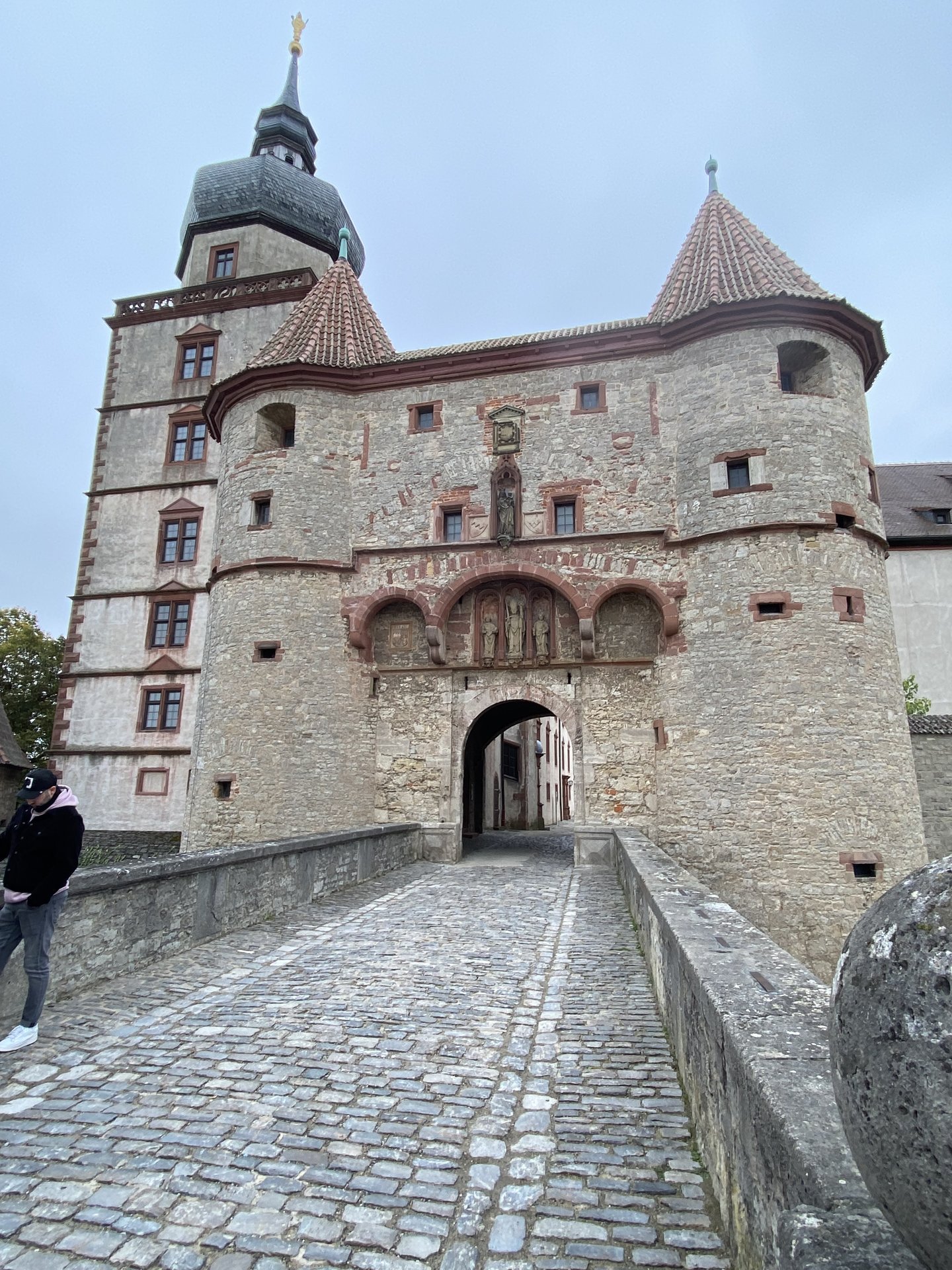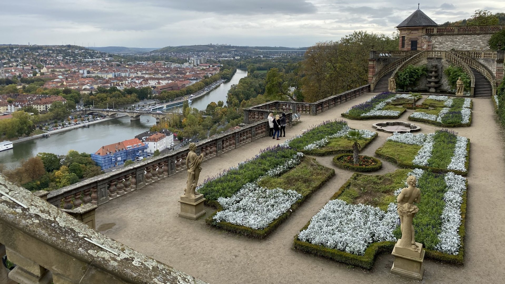 In der Sterngasse angekommen, stießen wir auf das Sterbehaus von Riemenschneider, einem der wenigen Häuser, die ihm nach seiner Verurteilung an Besitz noch geblieben waren. Direkt gegenüber sticht das Wohnhaus von Balthasar Neumann hervor, das auf seinem Dach eine Aussichtsplattform trägt, die sog. Neumannskanzel, von der aus der Architekt den Fortgang der Bauarbeiten an der Residenz überwachen konnte. Beide Häuser waren im Krieg zerstört, danach aber wieder nach alten Plänen aufgebaut worden.