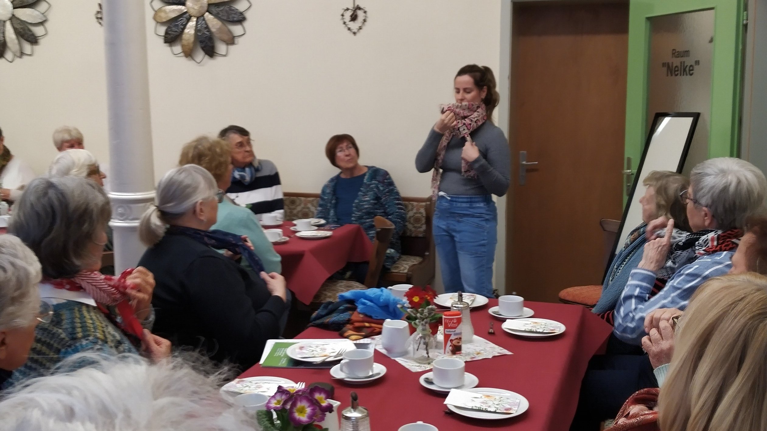 Im zweiten Teil der Veranstaltung präsentierte Julia Baumann, Mitglied der DEF-Youngster-Gruppe, gekonnt Tipps und Tricks zum modischen Binden von Damen-Schals und -Tüchern. Mit ihrem Stilbewusstsein und Geschick begeisterte sie die Anwesenden. Ihre Anregungen, modische Accessoires wie Schals und Tücher auch einmal etwas anders zu tragen, wurden gerne angenommen.