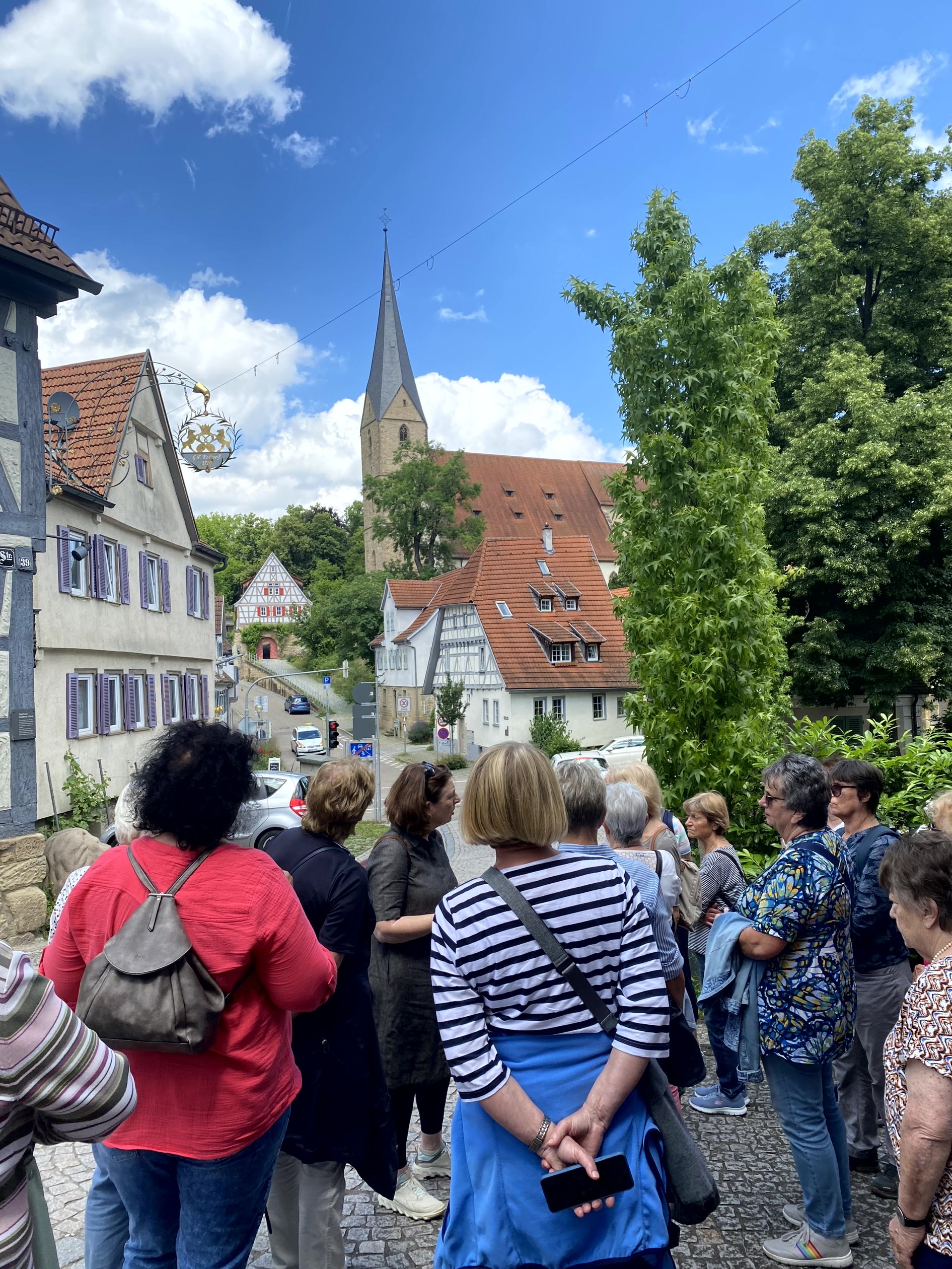 Gestärkt mit leckerem Mittagessen ging es weiter nach Marbach am Neckar. Bei einer Stadtführung wurden den Teilnehmerinnen die beiden berühmtesten Söhne der Stadt vorgestellt: Friedrich Schiller und Tobias Mayer. In Marbach steht das Geburtshaus von Friedrich Schiller, in dem er 1759 das Licht der Welt erblickte und die ersten vier Lebensjahre verbrachte. Weitere Stationen seines Lebens wurden kurz beleuchtet. Tobias Mayer wurde 1723 in Marbach geboren, auch sein Geburtshaus ist heute ein Teil eines Museums. Er war Kartograph und Astronom. Berühmt wurde er durch die genaue Berechnung des Längengrades und seine exakt vermessene Mondkarte. Die denkmalgeschützte Altstadt mit dem Oberen Torturm ist sehenswert, aber auch die Schillerhöhe mit einem schönen Blick auf den Neckar, dem Schillerdenkmal und dem Schiller-Nationalmuseum, sowie dem Literaturmuseum der Moderne haben uns beeindruckt. Da das Schiller-Nationalmuseum derzeit renoviert wird, ist ein Teil der Schillerausstellung im Literaturmuseum untergebracht. Hier werden das Leben und Wirken der vier Dichter Schiller, Hölderlin, Mörike und Kerner mit Textpassagen und persönlichen Gegenständen sehr anschaulich präsentiert. Die Führung ging auch auf die beeindruckende Architektur des von Daniel Chipperfield entworfenen Gebäudes ein. In der Dauerausstellung mit über 180 Exponaten aus den Sammlungen des Deutschen Literaturarchivs durch das gesamte 20. Jahrhundert, konnte unterstützt durch moderne interaktive, digitale Präsentationen auf einige Beispiele von Autografen eingegangen werden.