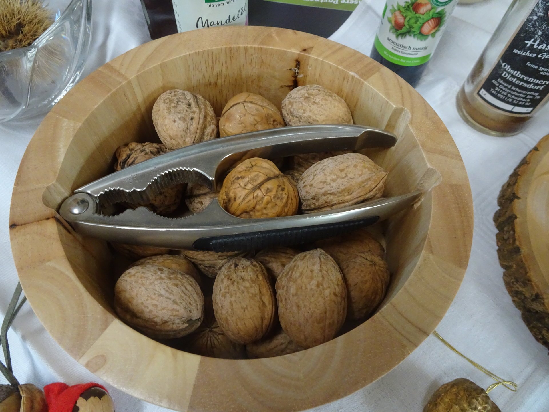 Ebenso hohes Engagement konnten die Teilnehmerinnen bei den „Winterhäuser Walnussknackern“ erkennen. Anne Marie Kleinschnitz, Anne Marie und Maria Maak stellten mit großer Begeisterung ihre Initiative vor. Im September ziehen ca. 30 Frauen aus dem Ort Winterhausen bei Würzburg los, um die Nussbäume ihrer Gemeinde und vieler Bekannten zu leeren. Täglich sind sie im Herbst unterwegs, um dann die gesammelten Nüsse anschließend zu trocken. Gebraucht wird jede Nuss! Aus etwa 150 Kilogramm Walnüssen mit Schale ergeben sich ca. 50 Kilogramm Kerne. Natürlich muss auch hier jede einzelne Nuss nach dem Knacken kontrolliert werden. Keine Schalenrückstände oder Schimmel dürfen in die Weiterverwertung kommen. Die fleißigen Frauen freuen sich schon auf diese Zeit des gemeinsamen Beisammenseins, auch wenn manchmal die Hände vom Nüsseknacken schmerzen. Jedes Jahr werden altbewährte Köstlichkeiten, aber auch neue Kreationen am Winterhäuser Weihnachtsmarkt angeboten. Beim letzten Weihnachtsmarkt am 1. Advent konnten die fleißigen Helfer ca. 3000 Euro einnehmen. Dieses Geld wird ohne Abzüge an eine soziale Einrichtung gespendet. Ein kleiner Auszug aus dem reichen Walnuss-Angebot: Walnussaufstrich, Likör, Wein, Pralinen, verschiedene Walnussplätzchen, Walnussöl, eingelegte schwarze Nüsse usw. Der ortsansässige Metzger bzw. Bäcker haben Walnussbratwurst und Walnussbrot zur großen Palette noch hinzugefügt. Auch im Seminar konnten sich die Frauen von der Güte einiger Köstlichkeiten überzeugen. Auf der Homepage können Rezepte eingesehen werden: