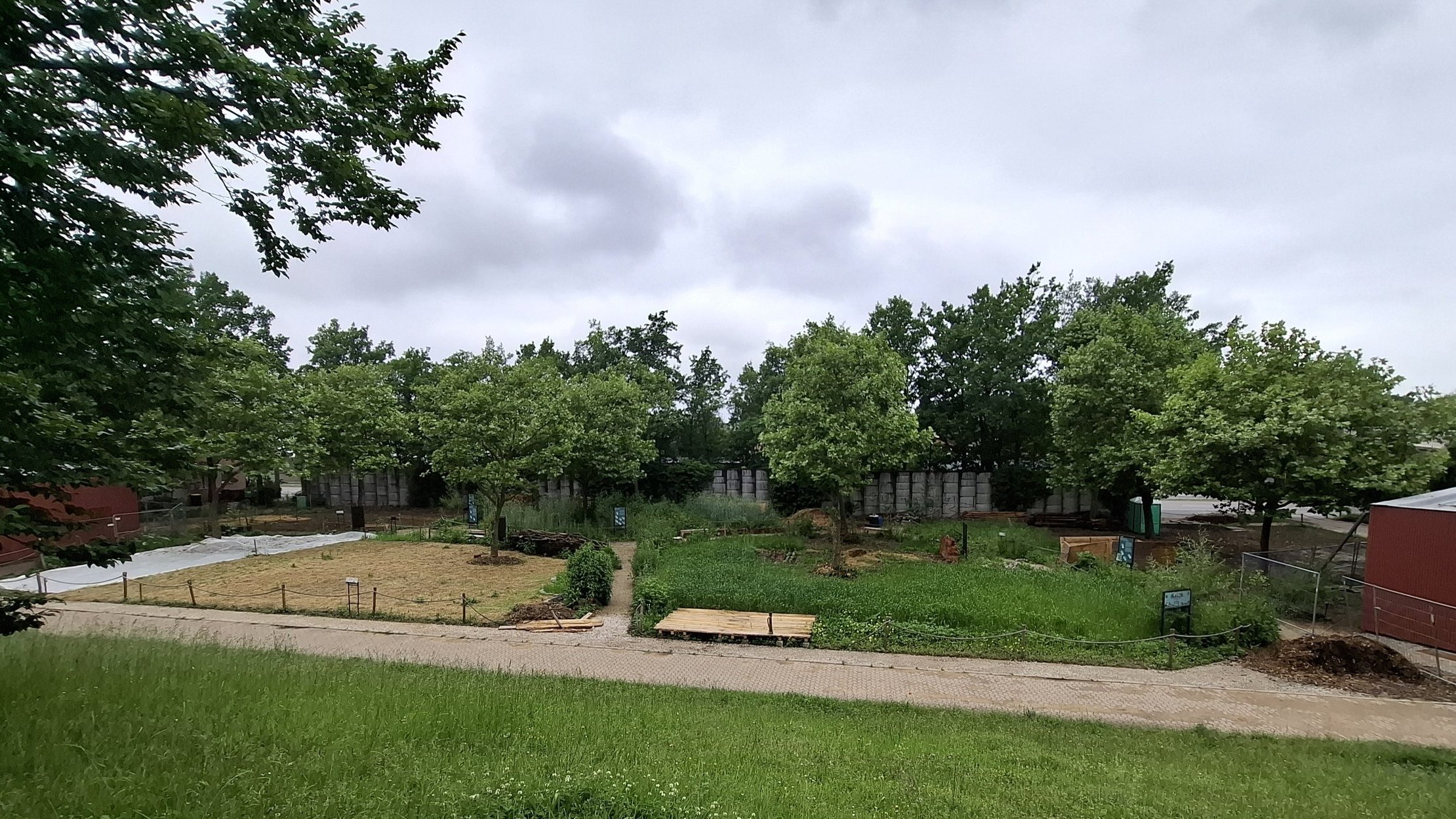 In Deutschland gibt es fünf Weltacker - weltweit 25 mit jeweils eigenem Konzept. Während der Führung gab es viele interessante Informationen zum Nürnberger Konzept. Der Weltacker Nürnberg war früher ein Parkplatz mit einer Fläche von ca. 2800 qm, davon wurde 2000 qm wurde denaturiert. Diese Fläche würde ein Mensch brauchen um ein Jahr zu überleben - bezogen auf Getreide, Obst, Nüsse und Faserpflanzen für Kleidung. Von dieser Fläche könnten aber auch 1,5 Schweine ein Jahr ernährt werden. Dies zeigt schon auf, dass beides schlecht von der gleichen Fläche zu bewerkstelligen ist.