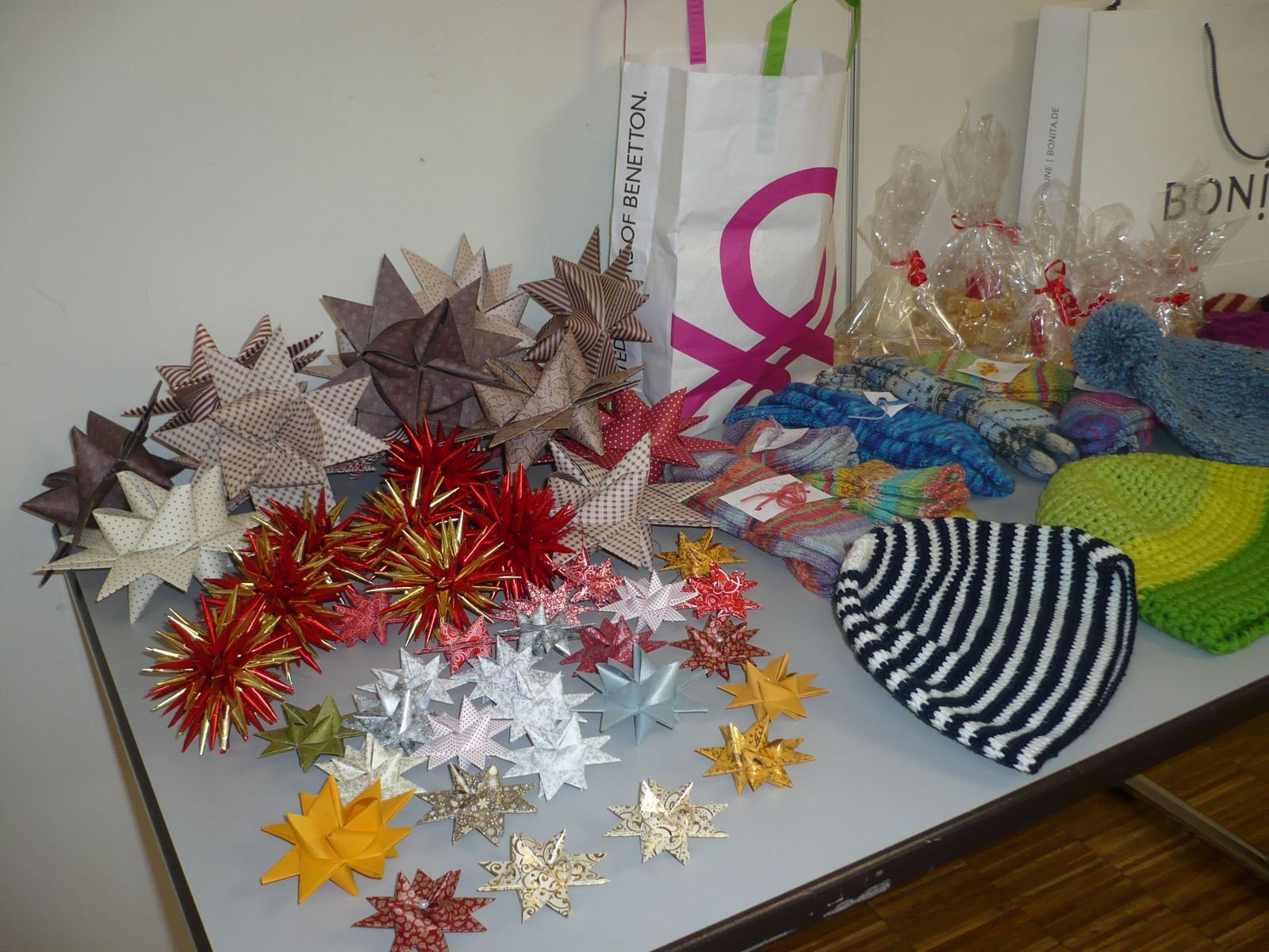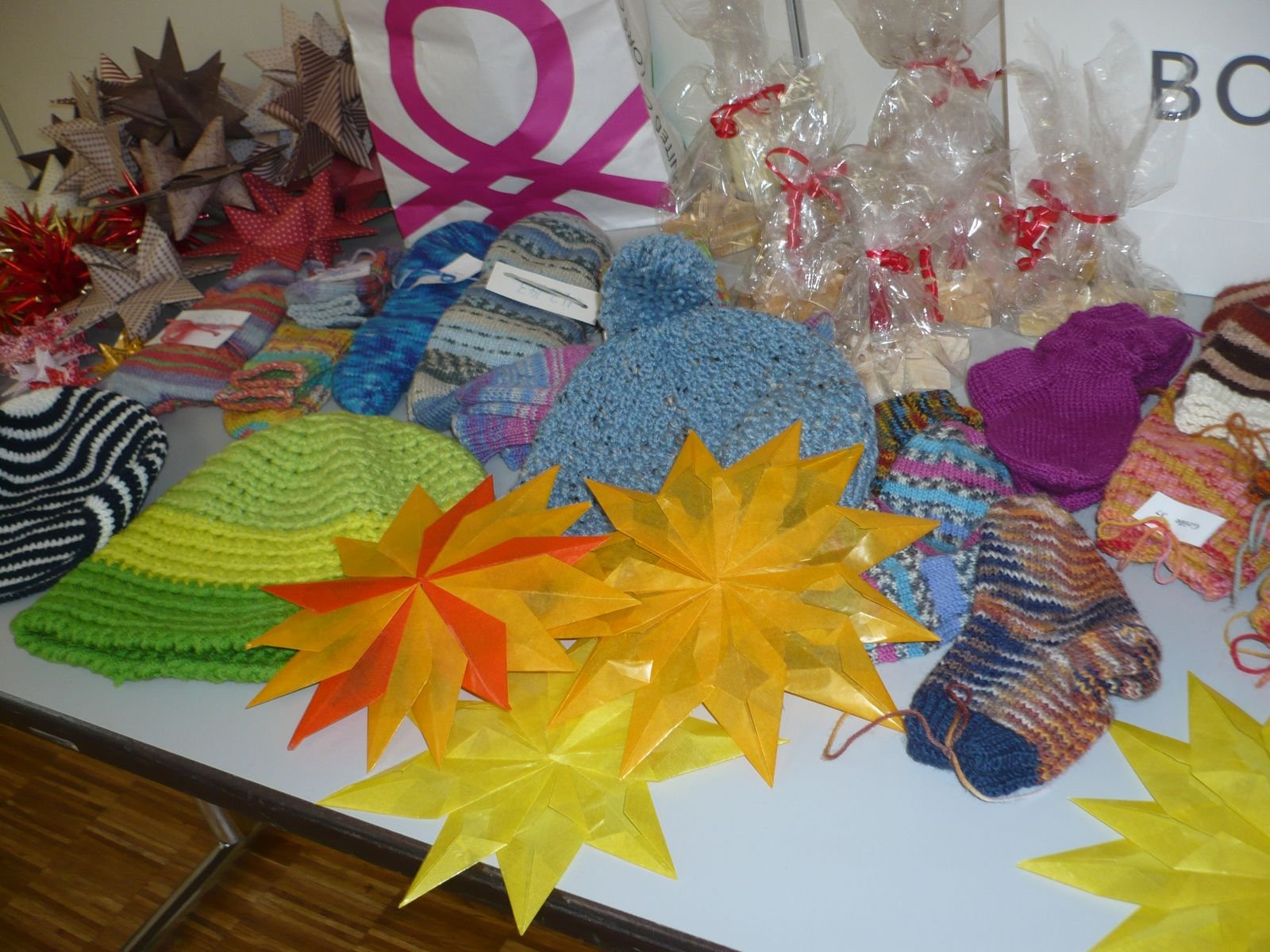 Um nicht so viel Zeit zu verlieren, hatte Gudrun Ziermann vieles schon vorbereitet und die Frauen konnten mit dem Basteln der Sterne beginnen. Mit Kaffee und Plätzchen konnte man sich bei der Arbeit stärken. Auf einem Tisch wurden die von einigen Frauen mitgebrachten gestrickten Mützen, Strümpfe, Babysöckchen und viele kreativ gestaltete Sterne ausgelegt. Es war ein stilles intensives, kreatives und eifriges Basteln.