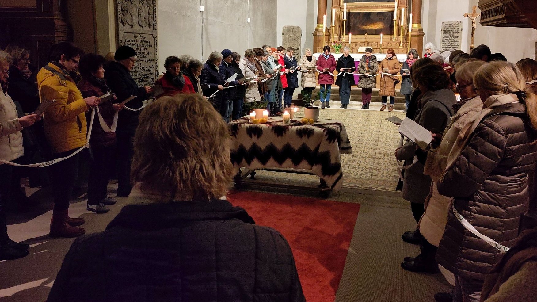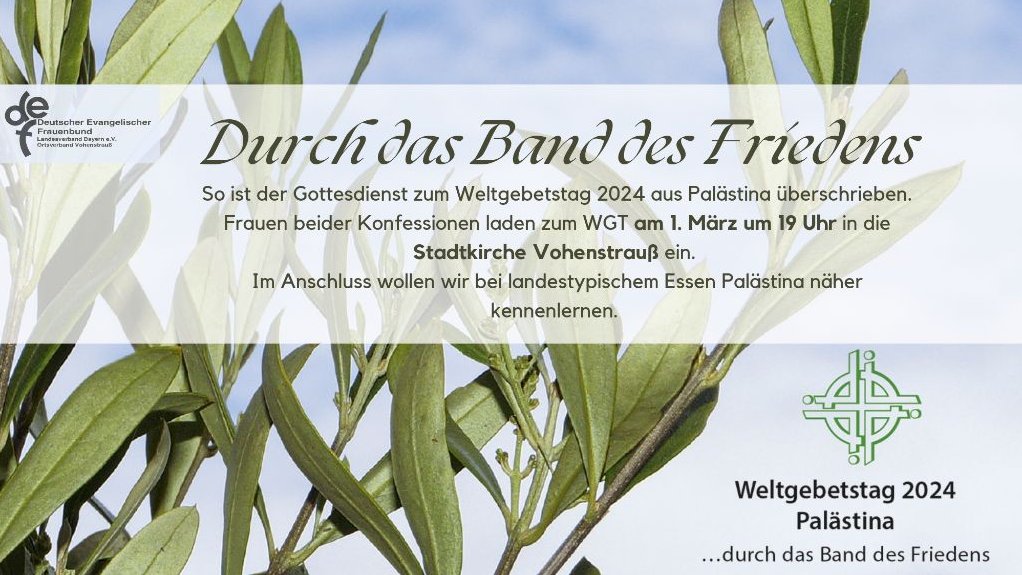 Über Konfessions- und Ländergrenzen hinweg knüpften Frauen am 01. März 2024 beim Weltgebetstag ein langes Band unter dem Motto "Durch das Band des Friedens“. Gewidmet ist es den Menschen in Israel und Palästina. Über 70 evangelische und katholische Frauen haben mit dem Evangelischen Frauenbund Vohenstrauß und den katholischen Frauenbünden aus Vohenstrauß und Altenstadt in der evangelischen Kirche in Vohenstrauß gebetet: mit Frauenporträts aus Palästina, für Mut, Hoffnung auf Frieden und für das Ende aller anderen Kriege. Beim Länderabend im Gemeindehaus gab es Informationen und Bilder zur Lebenssituation in Palästina. Dazu gab es ein großes Buffett mit Olivenbrot, Humus, Linseneintopf, Rote-Beete-Tarte, Bohnen sowie Eiern mit Za’atar und Zitrone. Als Nachspeise gab es süße Tahin-Schnecken oder einen Dattelaufstrich. Auf den selbst gestalteten Friedensbändern stand „Frieden“ in Hebräisch, Deutsch, Englisch und Arabisch. Der Chor „Sing mit“ gestaltete den Gottesdienst musikalisch.