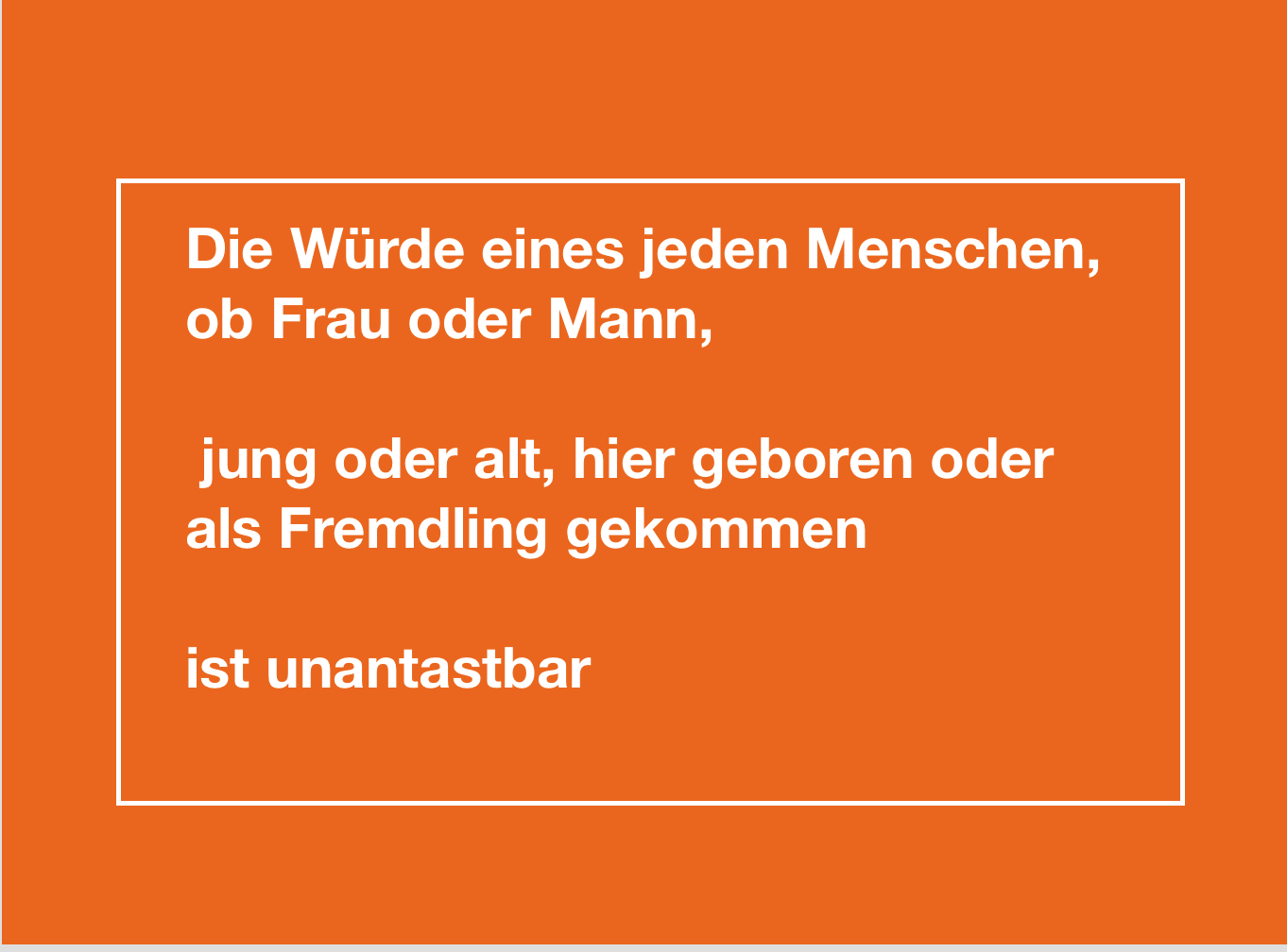 „Die Würde eines jeden Menschen, ob Frau oder Mann, jung oder alt, hier geboren oder als Fremdling gekommen ist unantastbar, unverhandelbar und steht jederzeit unter besonderem rechtsstaatlichen Schutz in Stadt und Land, im häuslichen und im öffentlichen Raum. Dafür setzen wir uns als Deutscher Evangelischer Frauenbund ein in der „Verantwortung für uns und Andere.“