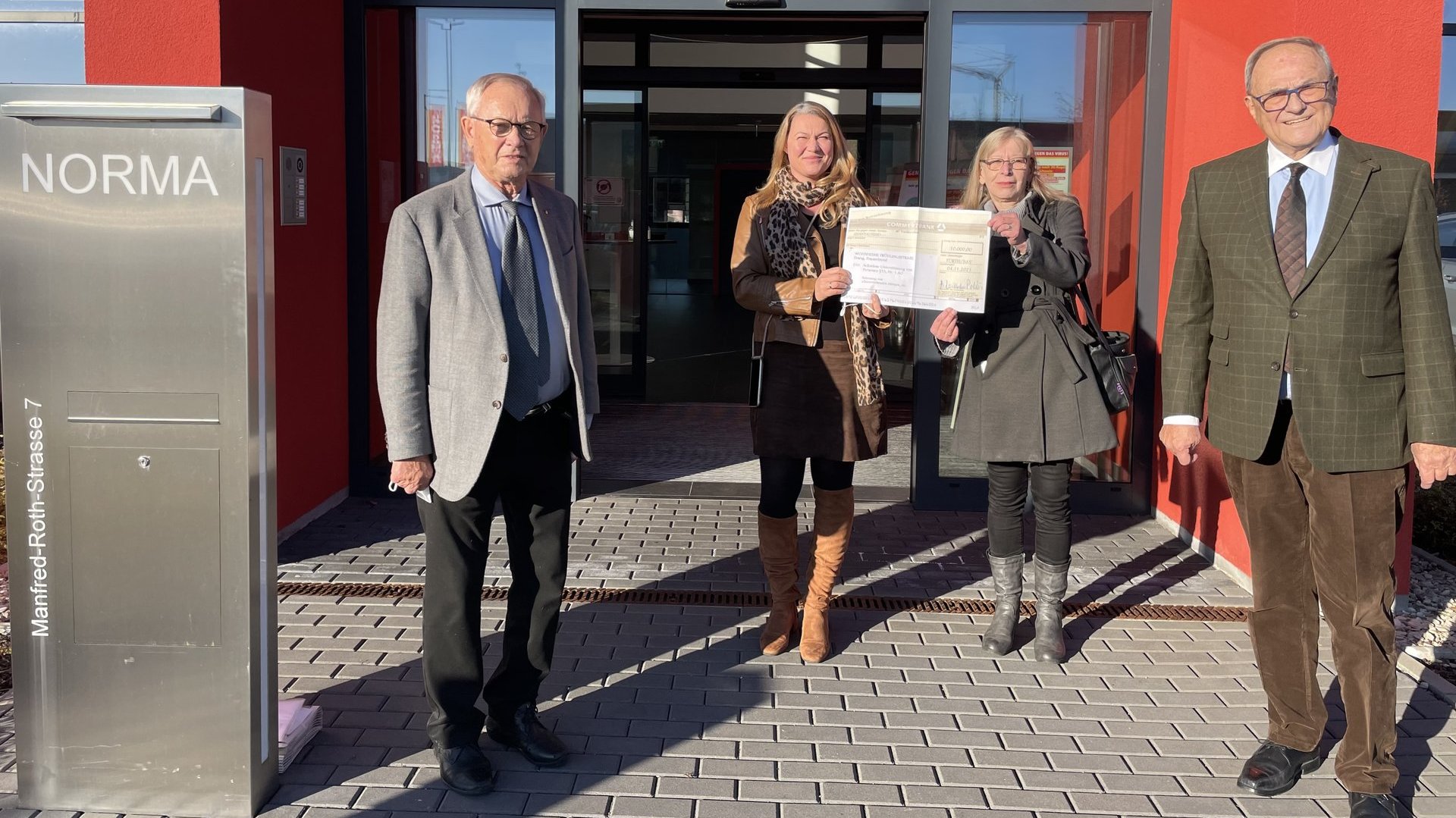 Bildunterschrift: Heimleiterin Daniela Zimmerer (2.v.l.) und die künftige Verwaltungsratsvorsitzende Sybille Just mit dem Scheck über 10.000 € von der Manfred-Roth-Stiftung
