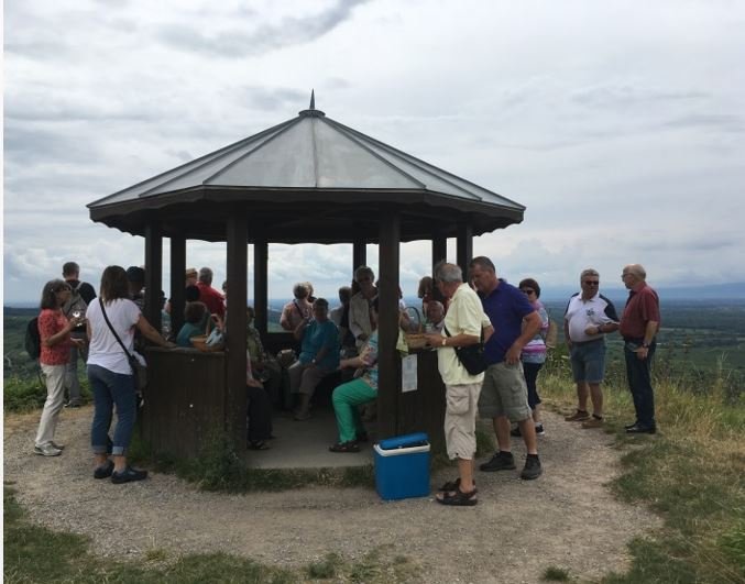 Nach der Mittagspause fuhren wir zum Weingut Landerer in Oberrotweil. Dort wurden wir mit einem Glas Secco begrüßt, bevor wir mit dem Traktorgespann eine Spazierfahrt durch die Weinberge zum traumhaften Aussichtspunkt „Mondhalde“ machten. Die Chefin des Weingutes erklärte uns dort ausführlich Ihr Weingut, den Weinbau und das Weinbaugebiet „Kaiserstuhl“. Am Kaiserstuhl wird der Weinbau im Gegensatz zum fränkischen Weinbau, terrassenförmig betrieben. Anschließend ging es weiter nach Burkheim in den Schwendi-Keller, wo uns eine stilvolle Weinprobe umrahmt von alemannischen Anekdoten und Geschichten erwartete. Außerdem erfuhren wir viel Wissenswertes über den bekannten Namenspatron des Kellers sowie über Burkheim und den Kaiserstuhl. Nach zwei fröhlichen Stunden fuhren wir dann zu unserem Hotel. Nach dem gemeinsamen Abendessen ließen wir den Abend in kleinen Gruppen bei netten Gesprächen bzw. im nahegelegenen Tanzlokal ausklingen.
