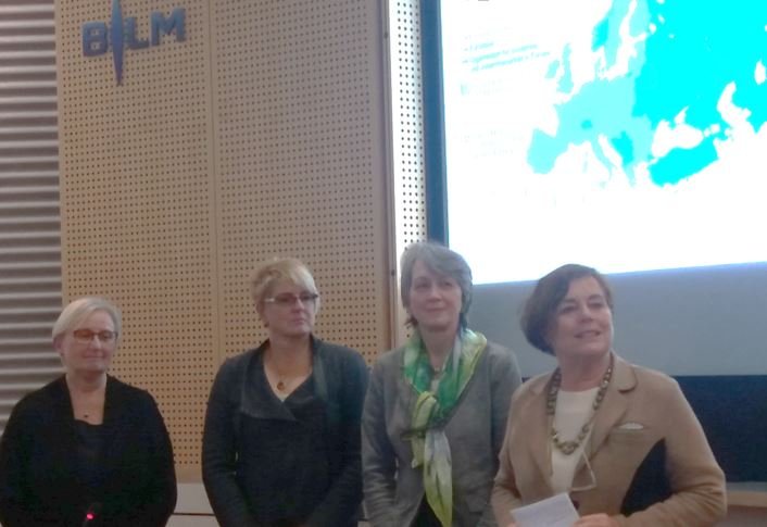 Das Referat der Europareferentin der BLM Johanna Fell lenkte den Blick auf den europäischen Rahmen unserer Medienwelt. Fell gab einen Überblick über die diversen schon existierenden medienrechtlichen Bestimmungen der EU, von den Fernsehrichtlinien der 80er und 90er Jahre bis zur AVMD-RL (Audiovisuelle Mediendienste-Richtlinie) von 2010, die nun zur Erneuerung ansteht. Sie selbst beobachtet für die BLM und Bayern diesen ebenso spannenden wie wichtigen Prozess. Bringt uns dieses mehr Schutz unserer Daten, mehr Qualität der Dienstleistungen auf diesem Bereich, und gibt das den Neuen Medien und dem Umgang mit ihnen einen den gewaltigen Entwicklungen gerecht werdenden Rahmen?