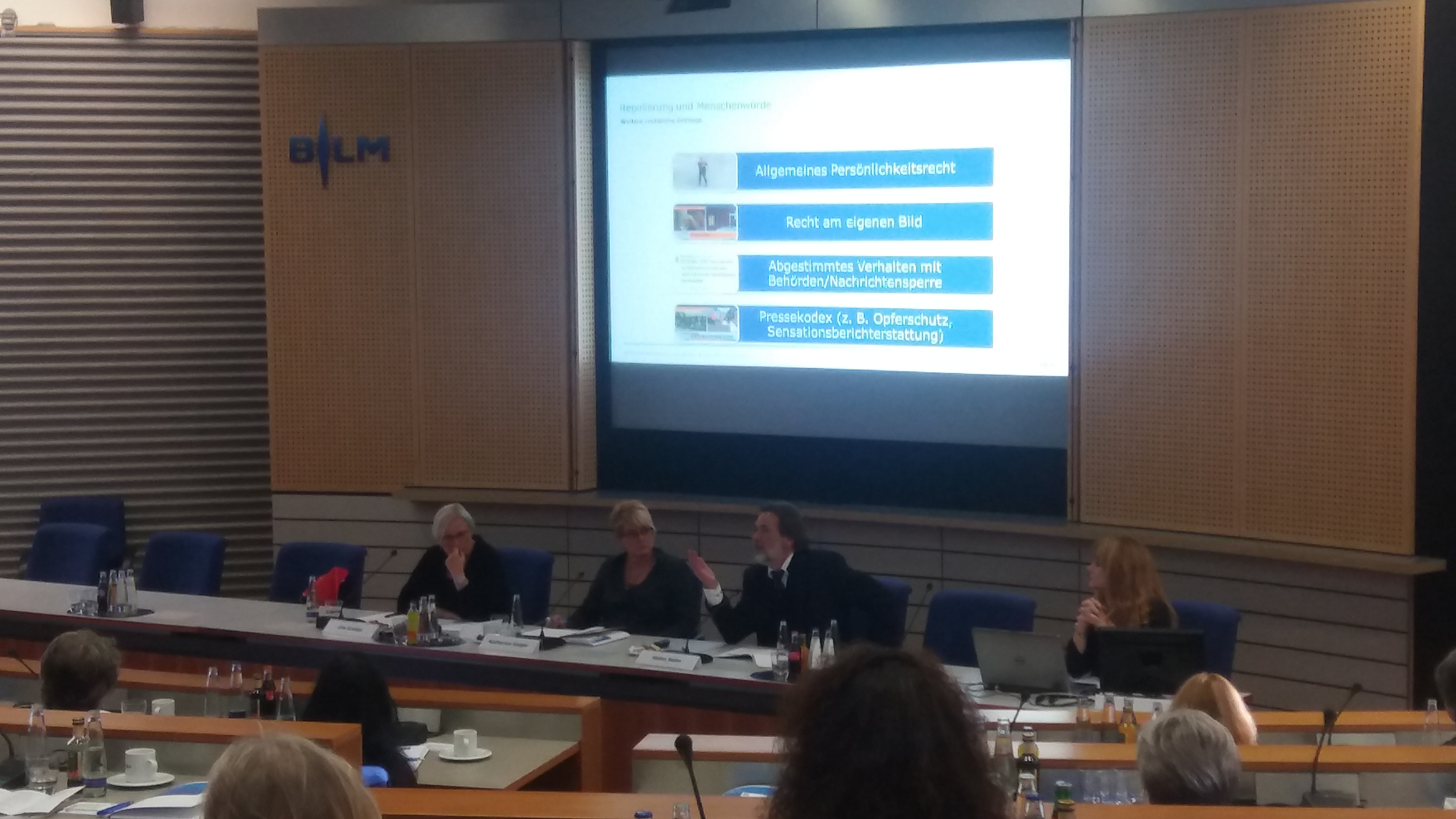Medienrätin Katharina Geiger kam in ihrer Begrüßung und Vorstellung des Programms gleich auf das sicher spektakulärste Beispiel der Medienberichterstattung des gesamten Jahres zu sprechen, als nämlich mit dem „Münchner Amoklauf“ der Terror von unserer Haustür angekommen war. Wie ist das, ist das in Ordnung, Handyaufnahmen des um sich schießenden Jugendlichen zu zeigen und dauernd zu wiederholen? Nach dem Motto der Tagung also „Muss die Pistole mit ins Bild?“ Oder ist das, um im Bild zu bleiben, „über das Ziel hinausgeschossen?“